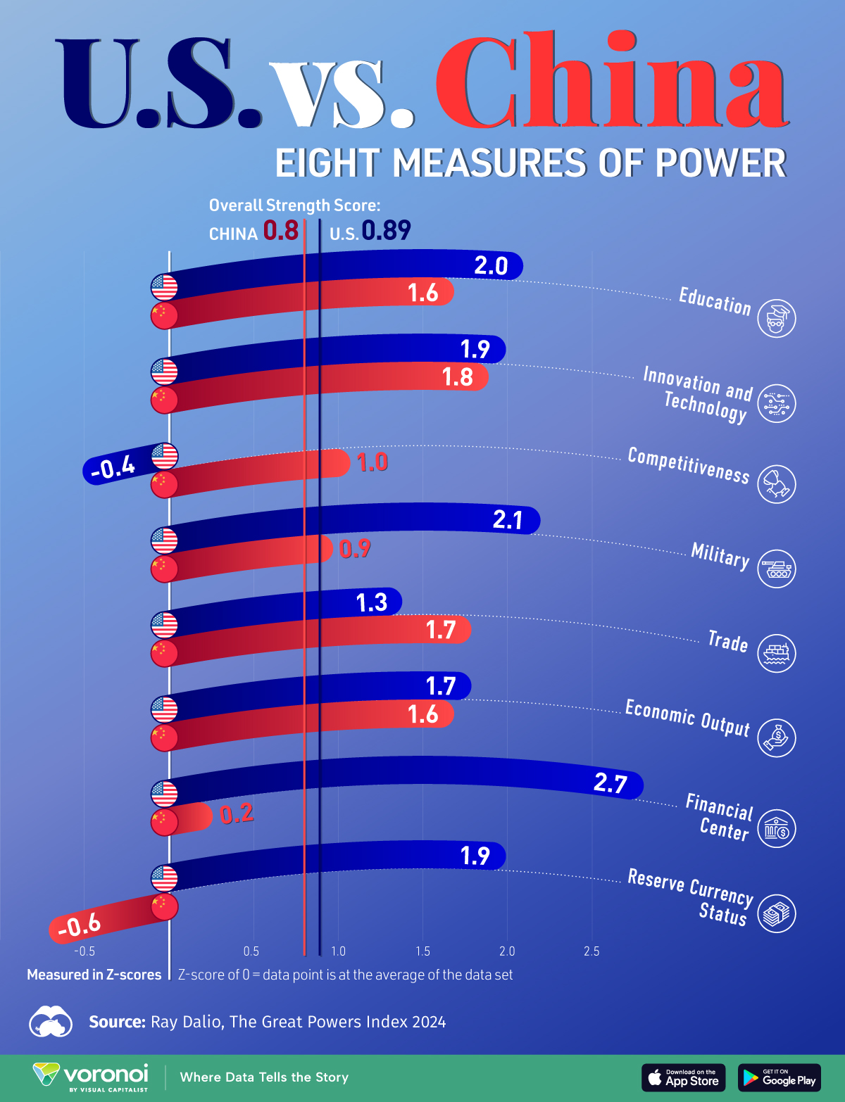 레이 달리오의 2024년 강대국 지수를 바탕으로 양국의 국력을 8가지 핵심 지표로 비교 분석한 결과, 미국이 여전히 우위를 점하고 있으나 중국의 급격한 성장세가 두드러졌다.