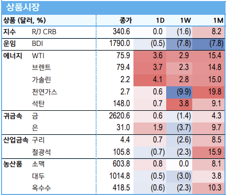 [상품시장 동향] : WTI 가격 3.6% 급등한 배럴당 75.85달러 거래. 중동 정세 일시 소강상태 속 허리케인에 따른 원유 공급 우려 반영. 금 가격은 0.5% 상승한 2,639.9달러/온스에 거래