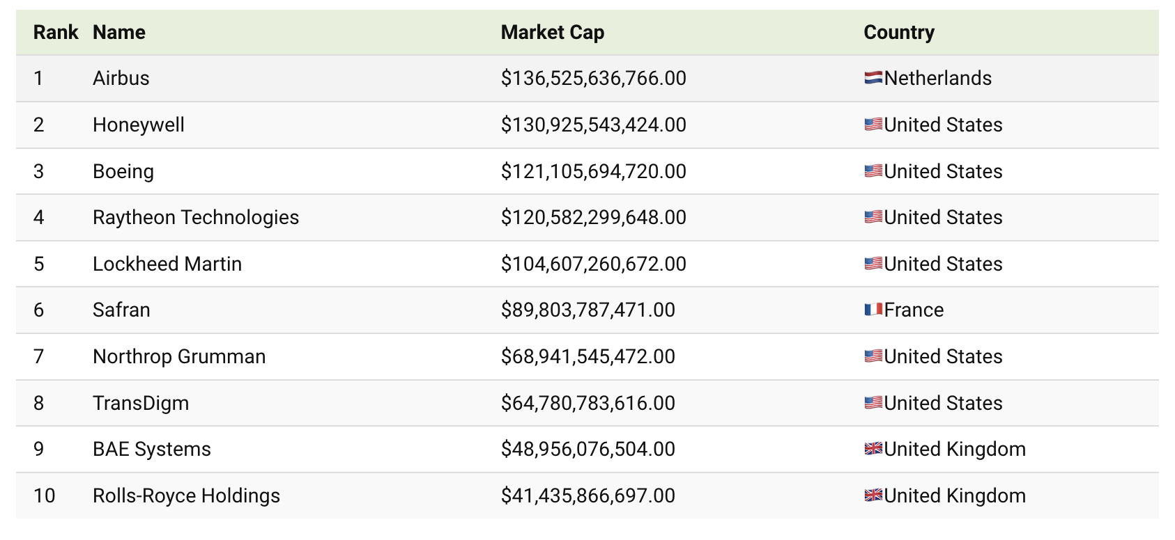 미국은 상위 10개 기업 중 6개가 자국 기업일 정도로 항공우주 분야에서 강세를 보이고 있다. 허니웰 외에도 보잉, 레이시온 테크놀로지스, 록히드 마틴 등이 순위권에 진입했으며, 이들은 상업 항공과 국방 분야에서 미국의 글로벌 리더십을 공고히 하는 데 기여하고 있다.