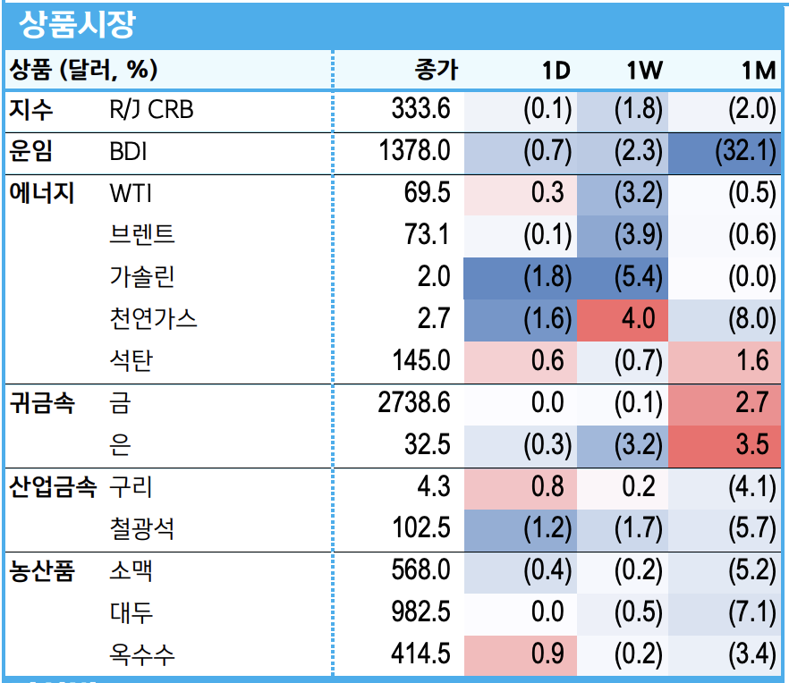 - WTI 69.5달러(+0.3%): 중동 불안에도 미국 경기 둔화 우려로 상승폭 제한