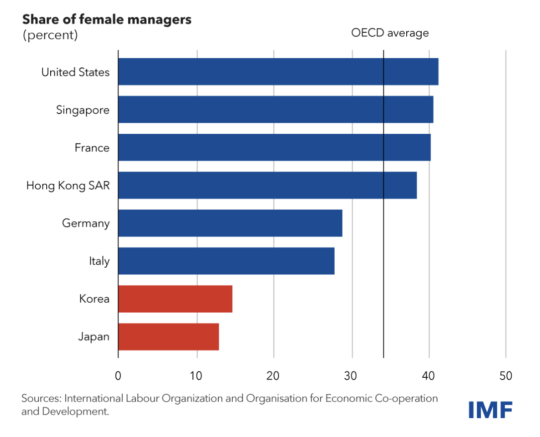 여성의 노동 참여율 증가는 일본과 한국의 팬데믹 이후 경제 회복에 이미 기여하고 있다. IMF 분석에 따르면, 2035년까지 한국의 남녀 근로 시간 격차를 OECD 평균으로 줄이면 한국의 1인당 GDP는 18% 증가할 수 있다. 일본의 경우, STEM(과학, 기술, 공학, 수학) 분야의 성별 격차를 해소하면 총요소생산성이 20% 상승하고 사회복지 수준은 4% 향상될 수 있다.