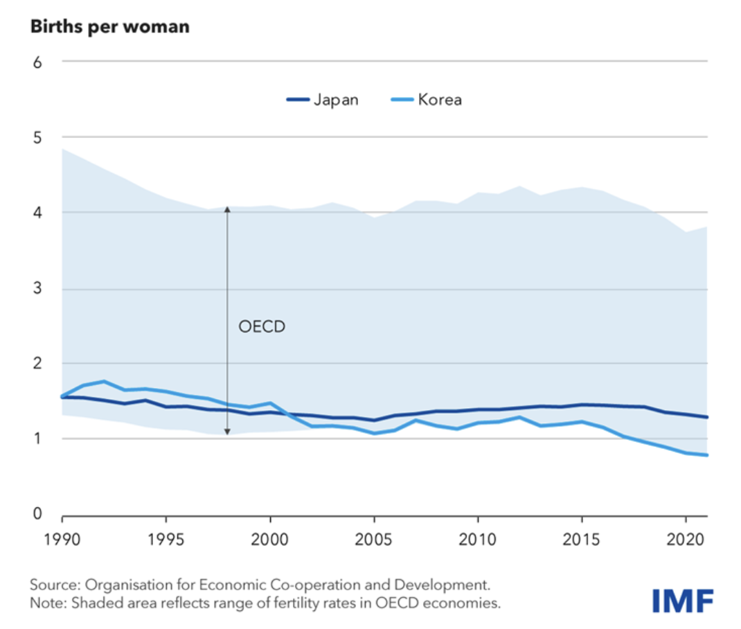 이로 인해 결혼과 출산이 점점 늦어지고 있으며, 이는 출산율 감소의 주요 원인 중 하나다. 현재 한국과 일본의 출산율은 각각 0.72와 1.26으로 세계 최저 수준에 해당한다. 또한, 남성과 여성 간의 고용 및 임금 격차는 여전히 크며, 특히 리더십 직책에서는 두 나라 모두 여성 비율이 15% 미만으로 G20 국가 중 최하위권에 속한다.