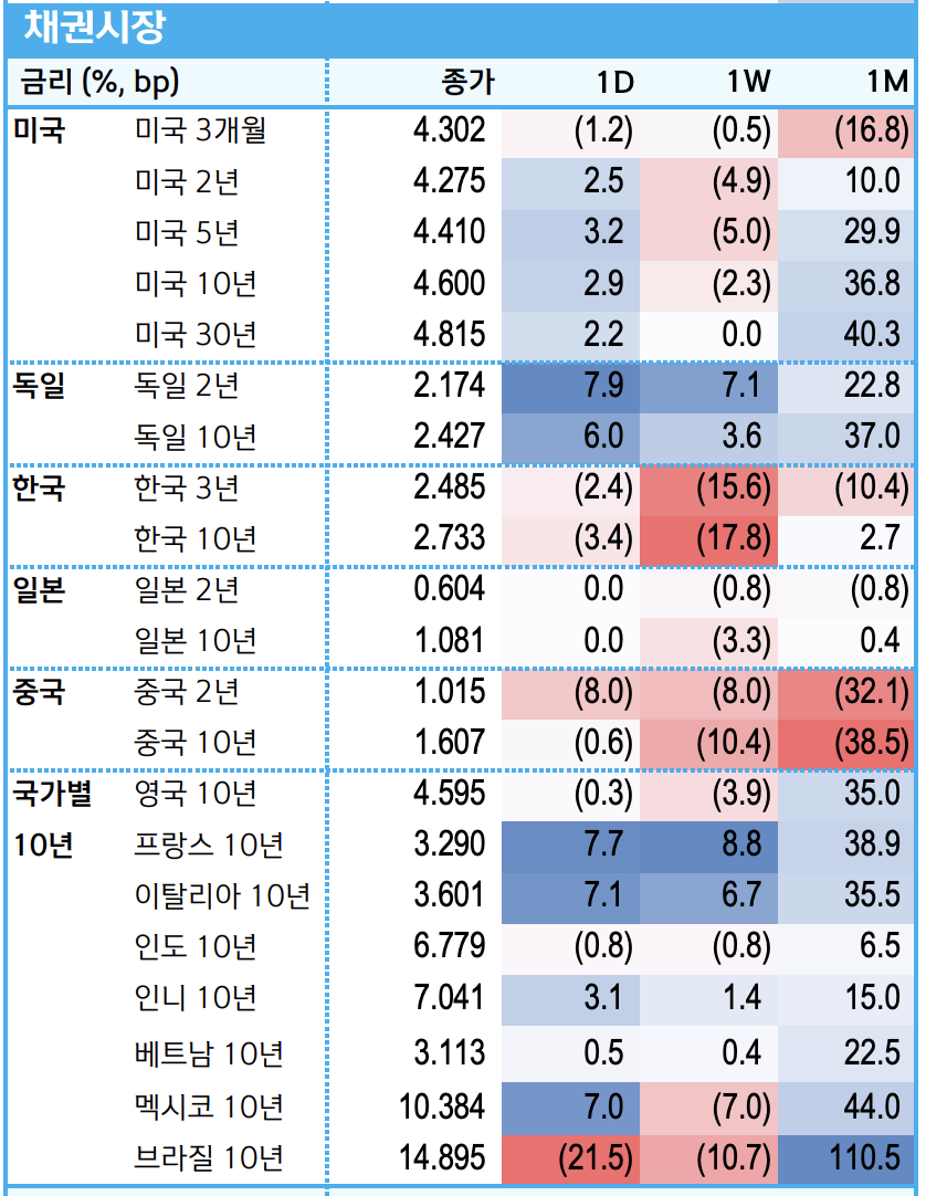 - 중국: 상해종합지수는 -1.6% 하락. 무역전쟁 우려와 경기 불확실성이 지속되며 약세를 보였음. 특히 소비재 및 기술 관련 종목에서 큰 폭의 하락이 관찰되었고, 정부의 경기 부양책 발표에도 시장 반응은 제한적이었음.