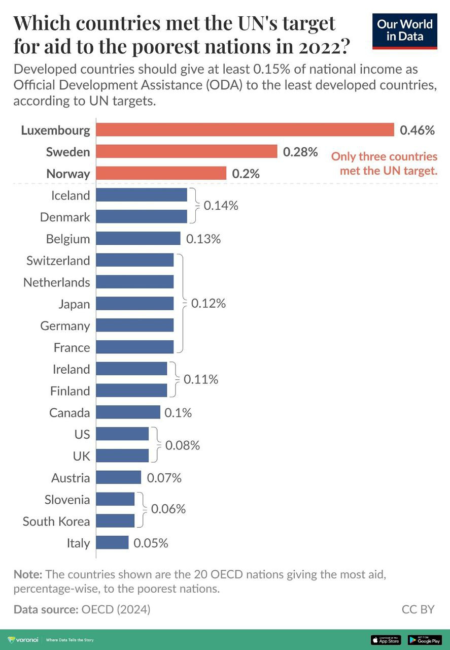 이 그래픽은 대부분 고소득 국가들로 구성된 OECD 회원국을 기준으로, 2022년 최빈국(LDCs)에 대한 순수 공적개발원조(ODA)를 국내총소득(GNI) 대비 비율로 측정해 순위를 매긴 것이다. 이 수치는 UN이 추적한 데이터를 바탕으로 하며, 1980년대부터 제시된 기준선인 GNI의 0.15%를 초과한 국가는 단 3개국에 불과했다.
